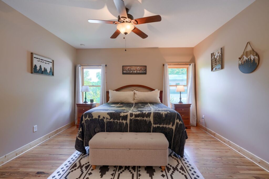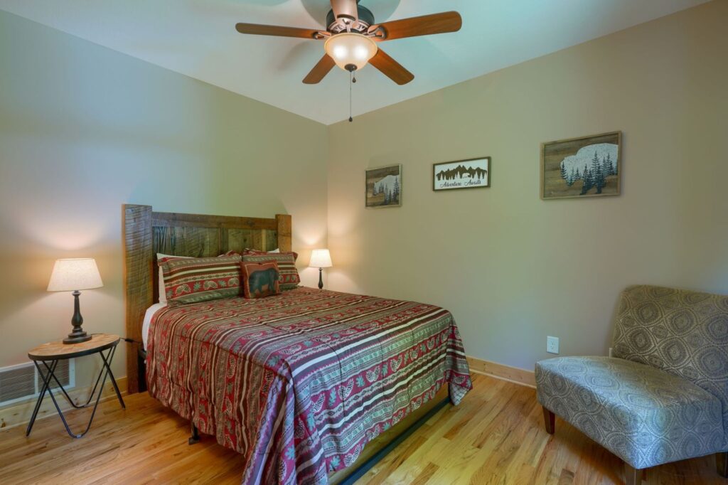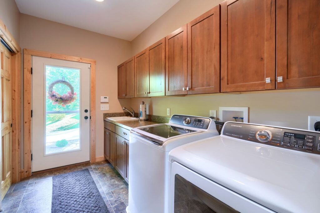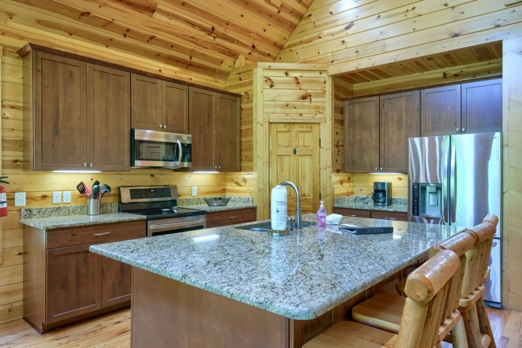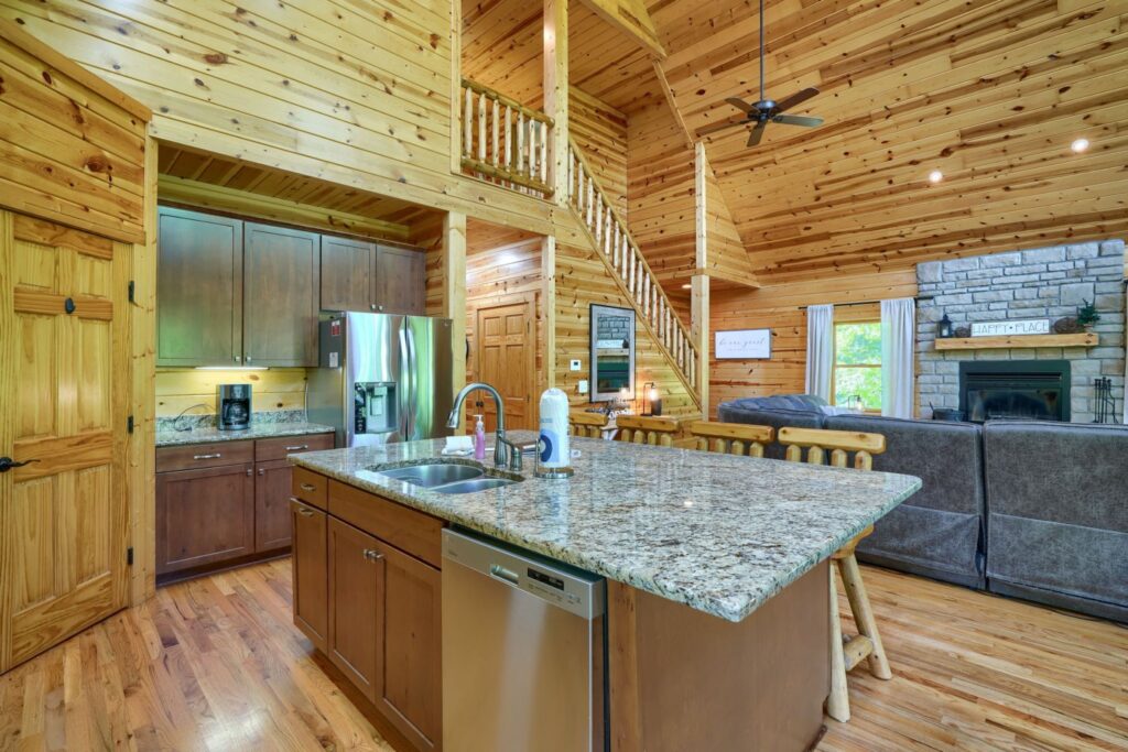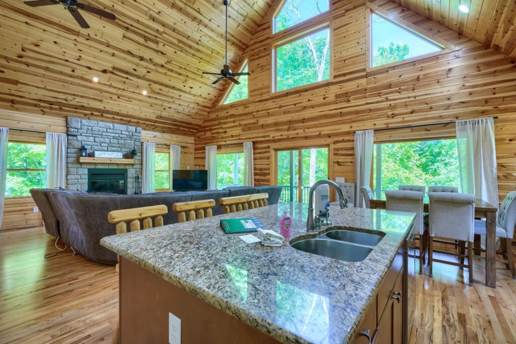 Greatroom with large sectional sofa, wood burning fireplace, picture windows, dining room with seating for 6, island seating for 4, full kitchen with refrigerator, microwave, dishwasher, electric range; laundry room with sink and counter, master king bedroom with a master insuite with seperate tub and shower, private toilet, double sink, and walk in closet; half bathroom, and private queen bedroom.