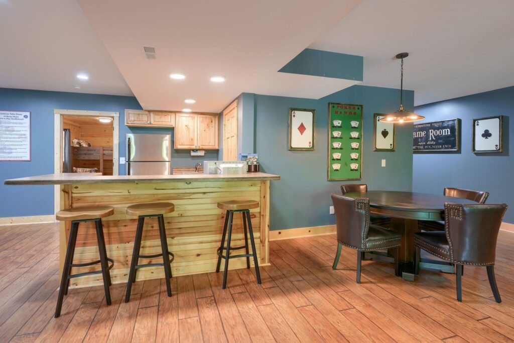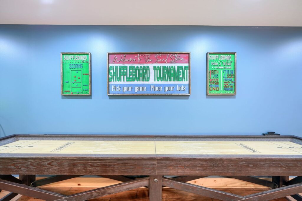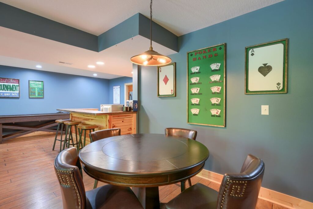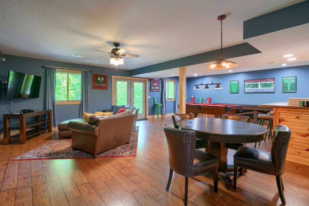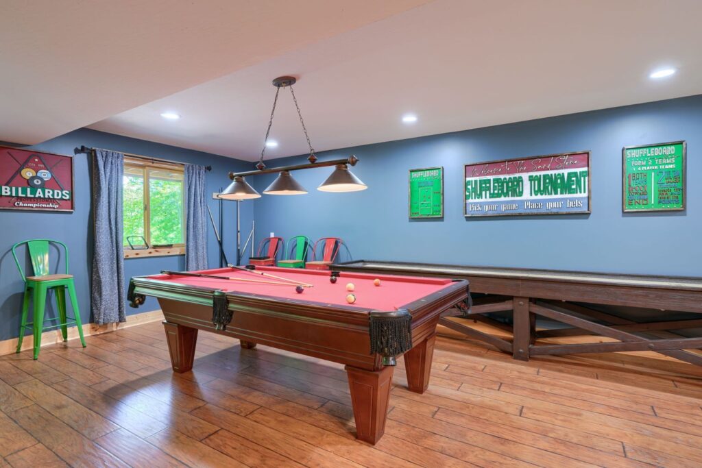 Recreation area with pool table, poker table, and shuffle board, sectional sofa with large tv, bar with sink, fridge, and microwave; full bathroom with walk in shower, bedroom with 2 queen beds, and bedroom with twin bunk beds and 2 twin beds (sleeps 4).