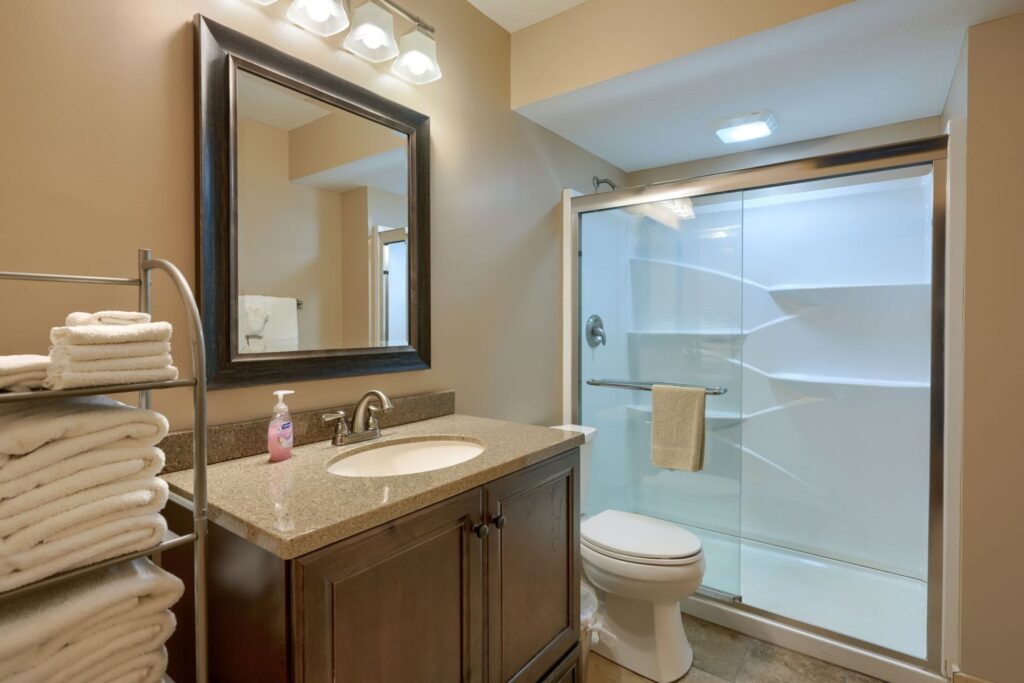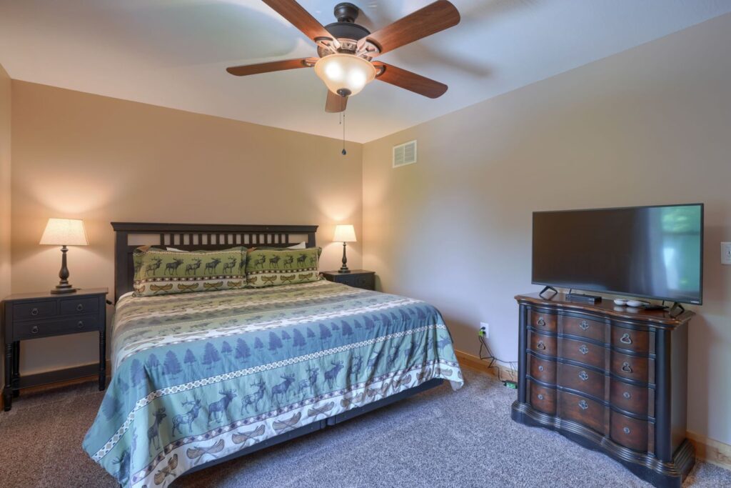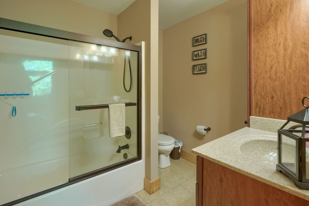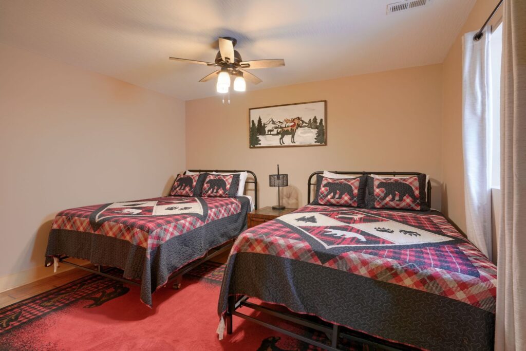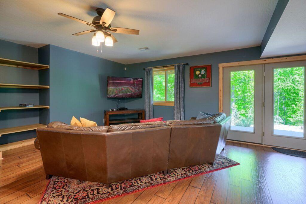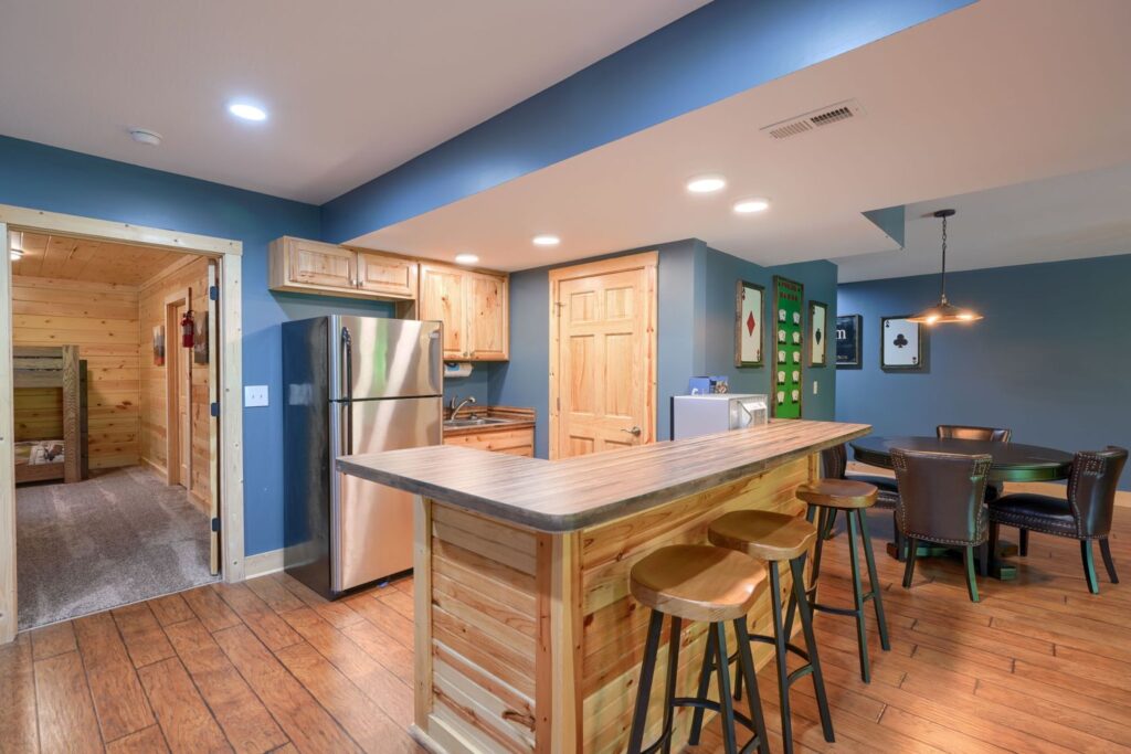Recreation area with pool table, poker table, and shuffle board, sectional sofa with large tv, bar with sink, fridge, and microwave; full bathroom with walk in shower, bedroom with 2 queen beds, and bedroom with twin bunk beds and 2 twin beds (sleeps 4).