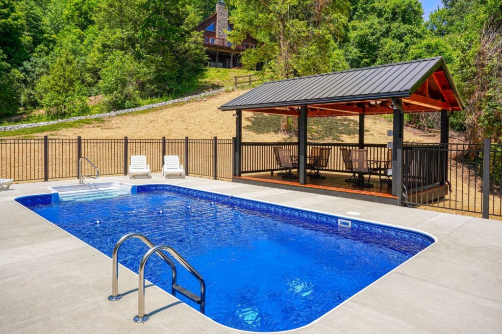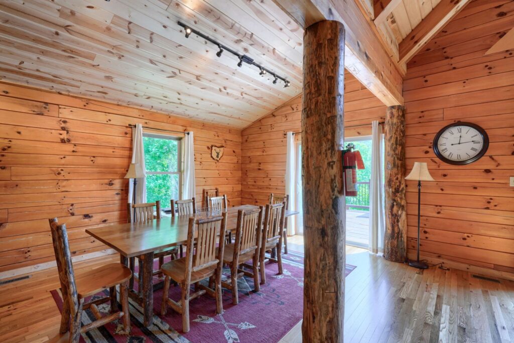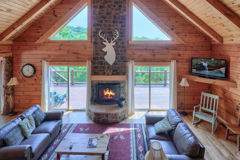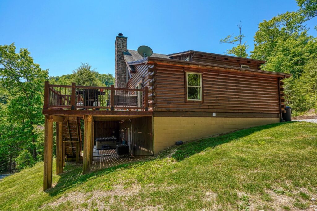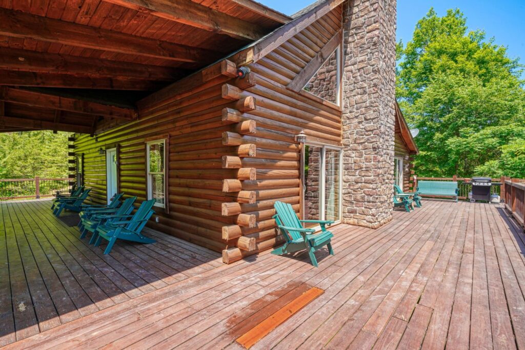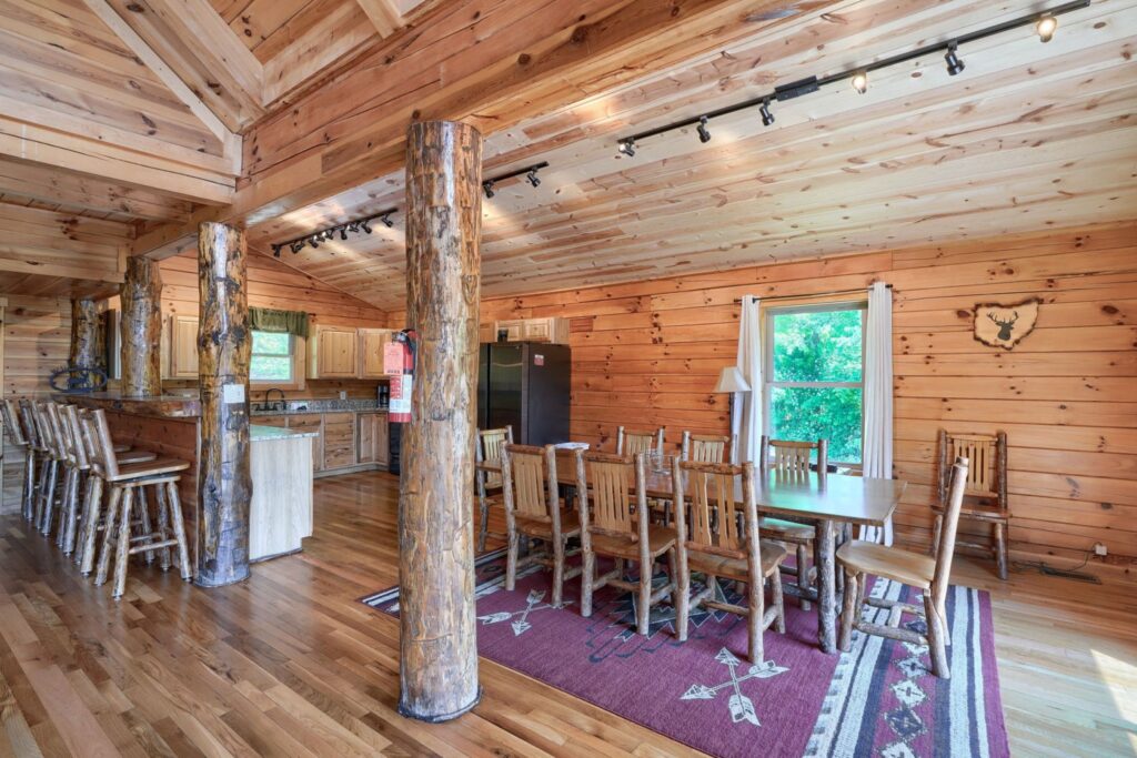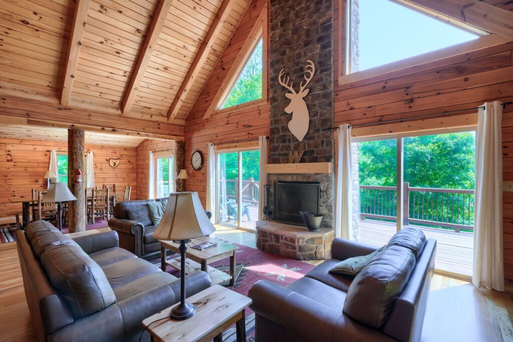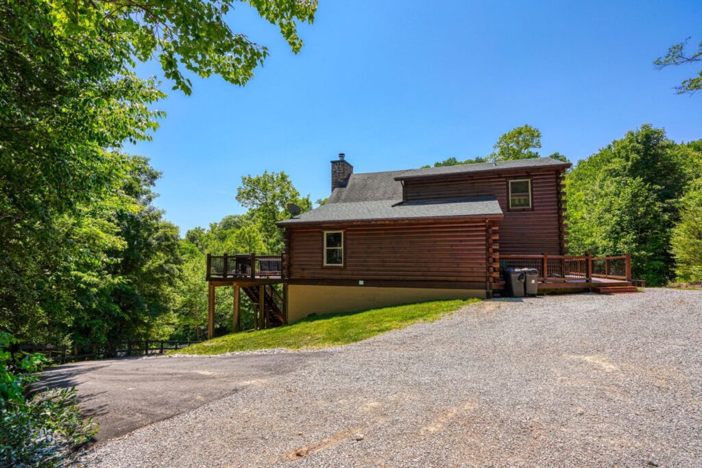 Seasonal in-ground pool, open Memorial Day- October 1st (weather permitting) This remodeled 5 br lodge is on 17.5 private acres with an onsite rock outcropping and hiking trail. This luxurious log home sits atop a hill with expansive views valleys and is just minutes from Rock House. Recently remodeled and designed! It offers luxury, privacy, and the perfect location for your next family vacation or long-awaited friends’ trip! Must be 25 years or older to rent.