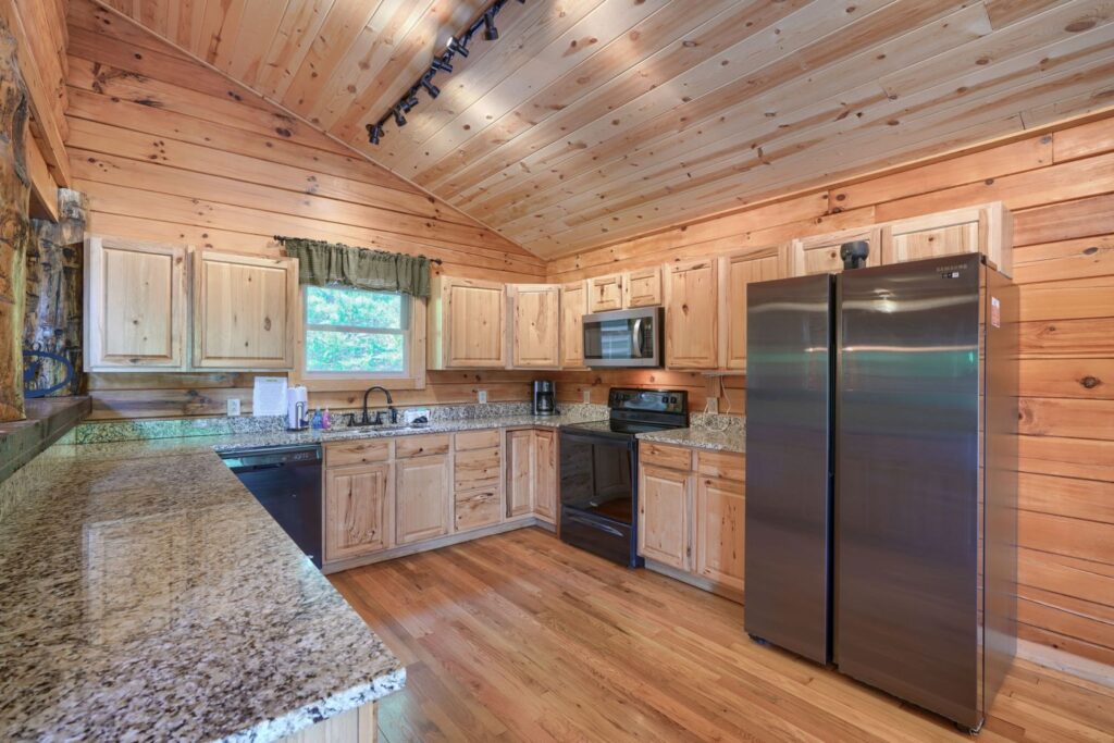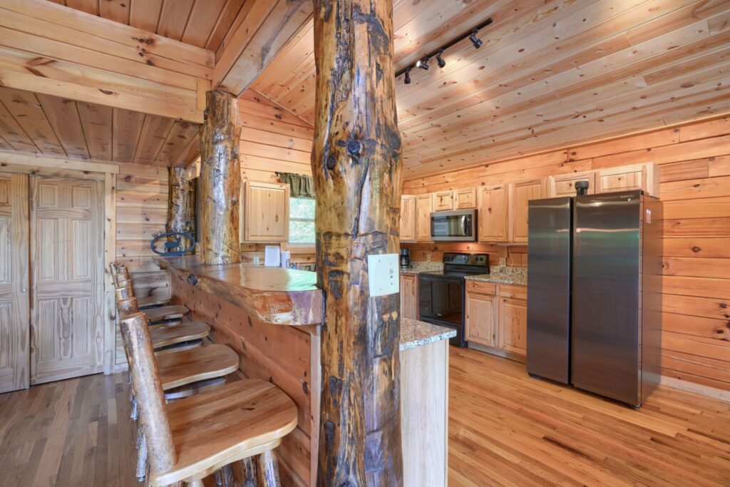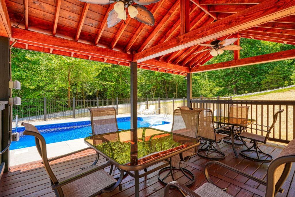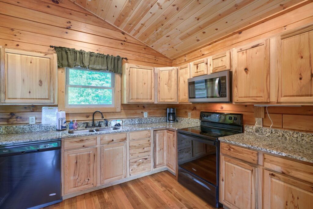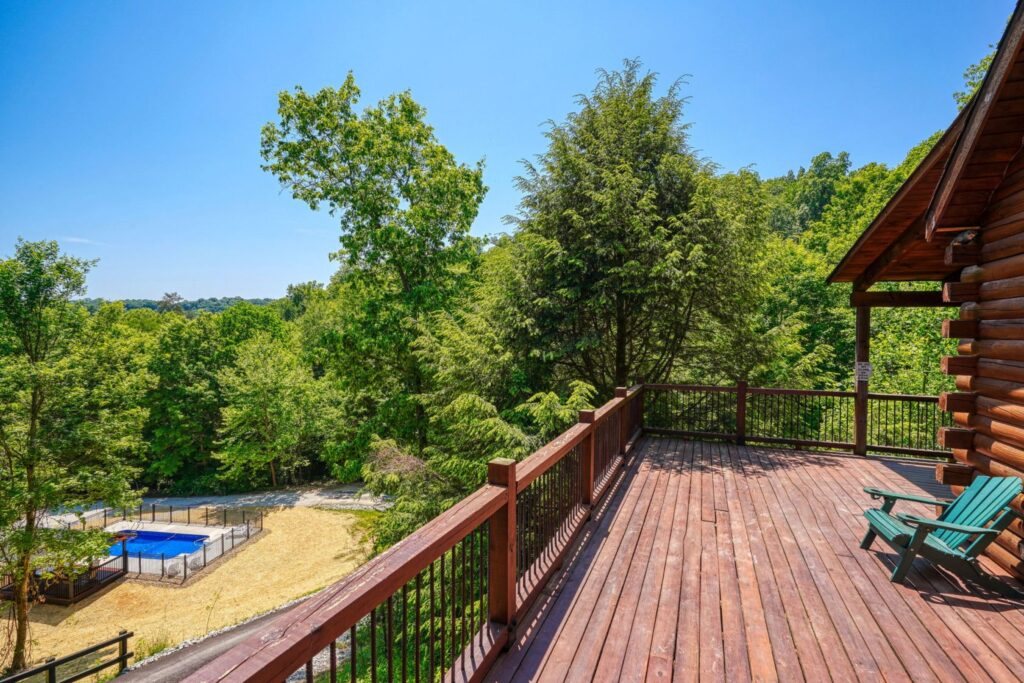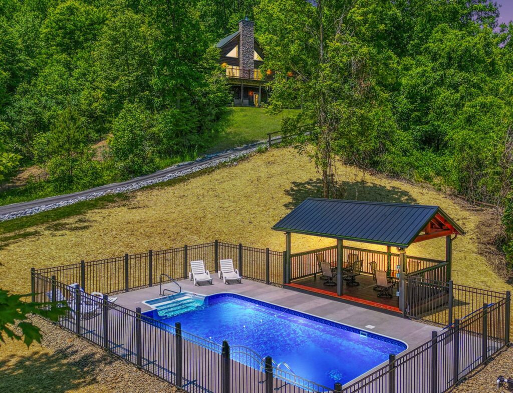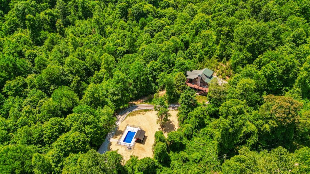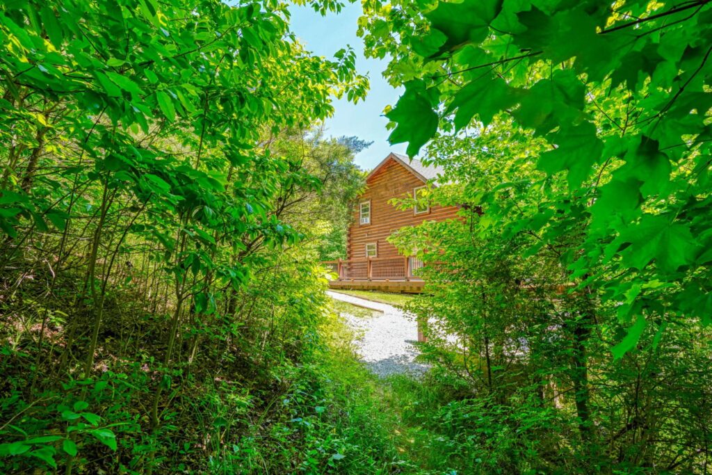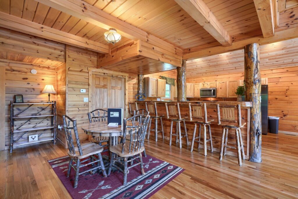 Seasonal in-ground pool, open Memorial Day- October 1st (weather permitting) This remodeled 5 br lodge is on 17.5 private acres with an onsite rock outcropping and hiking trail. This luxurious log home sits atop a hill with expansive views valleys and is just minutes from Rock House. Recently remodeled and designed! It offers luxury, privacy, and the perfect location for your next family vacation or long-awaited friends’ trip! Must be 25 years or older to rent.