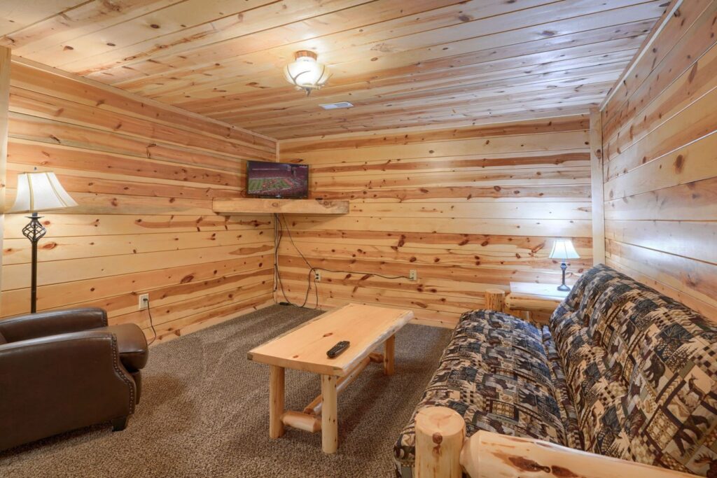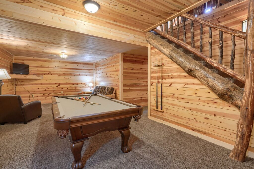 Recreation area with pool table, futon, private queen bedroom, twin bunk room, full bathroom with tub/shower combo.
